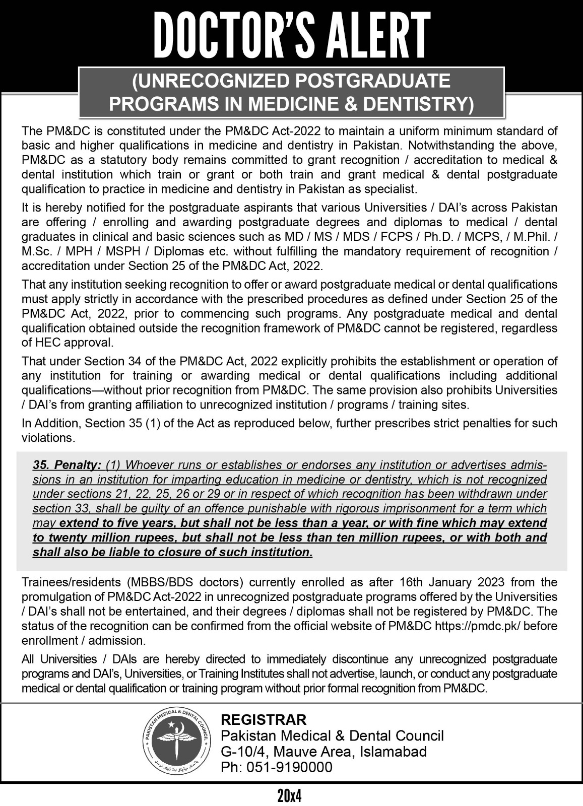 | 13 | Does PM&DC makes call to the Doctor? | In very unique circumstances this action may be taken and, in that case, only Official landline number with code 051-9190000 will be used. However, it is very rare case. |